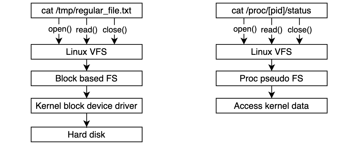 User space tools such as ps, top, free check for this virtual fs and get system + processes information. We call procfs as a virtual fs since it鈥檚 not actually existing on the hard disk. Every time you use system call to access them kernel redirect it to different part with regular directories or files.