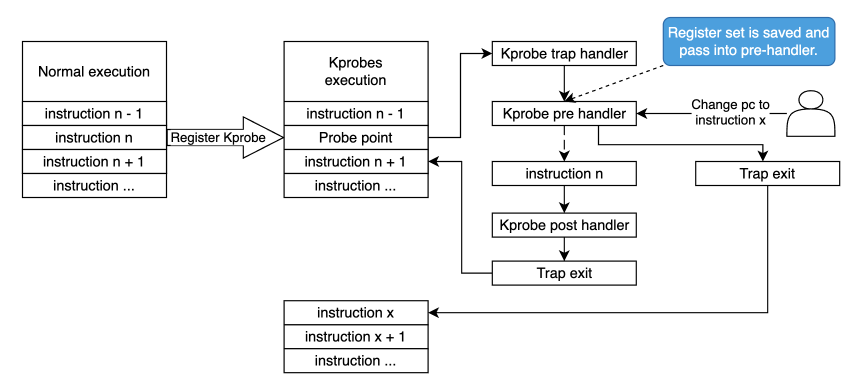 Since Kprobes can probe into kernel running code, it can change the register set. This is what we鈥檒l do in this blog, we change the kernel execution path by edit the saved pc register to point to our target instruction, and then return non zero value from the pre_handler, so Kprobes will bypass the single step and just return to the given address. Will dig deeper in next sections.